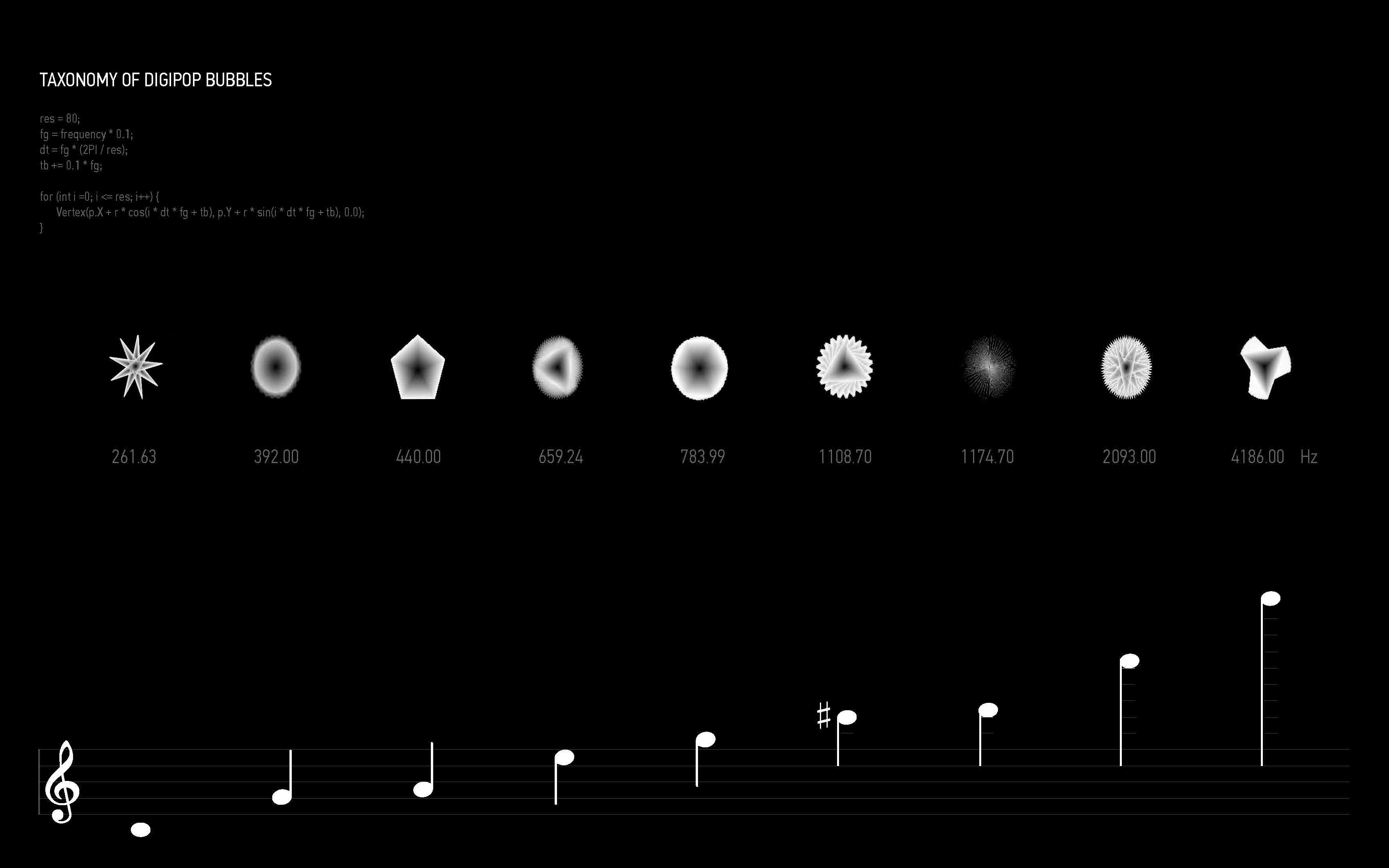 Each digiPop bubble remembers the frequency used to create it that is then played back as it moves across the screen. A high A note (440 Hz) is played when bubbles collide into each other while a pop sound plays when a bubble bursts. These sounds create a feedback loop into the bubble formation, accompanying the player's voice for a unique concerto.