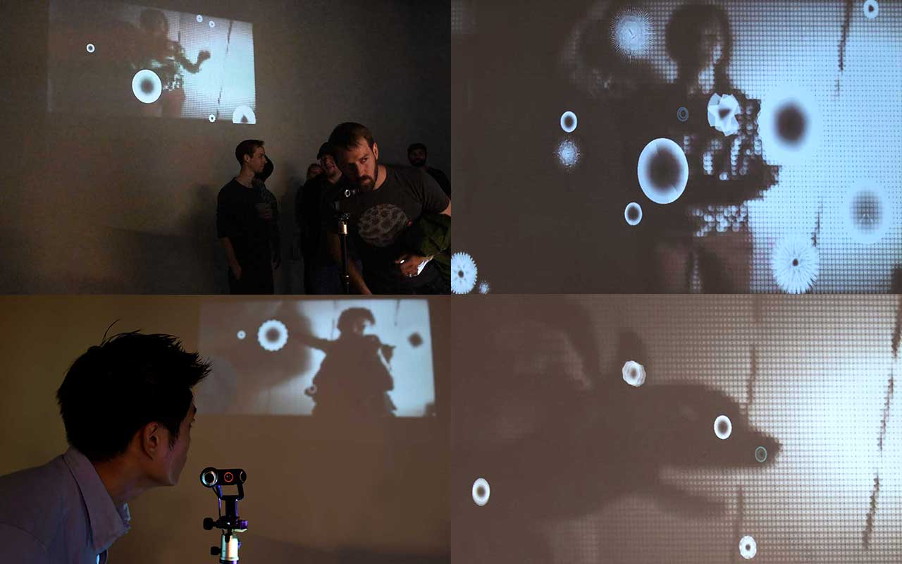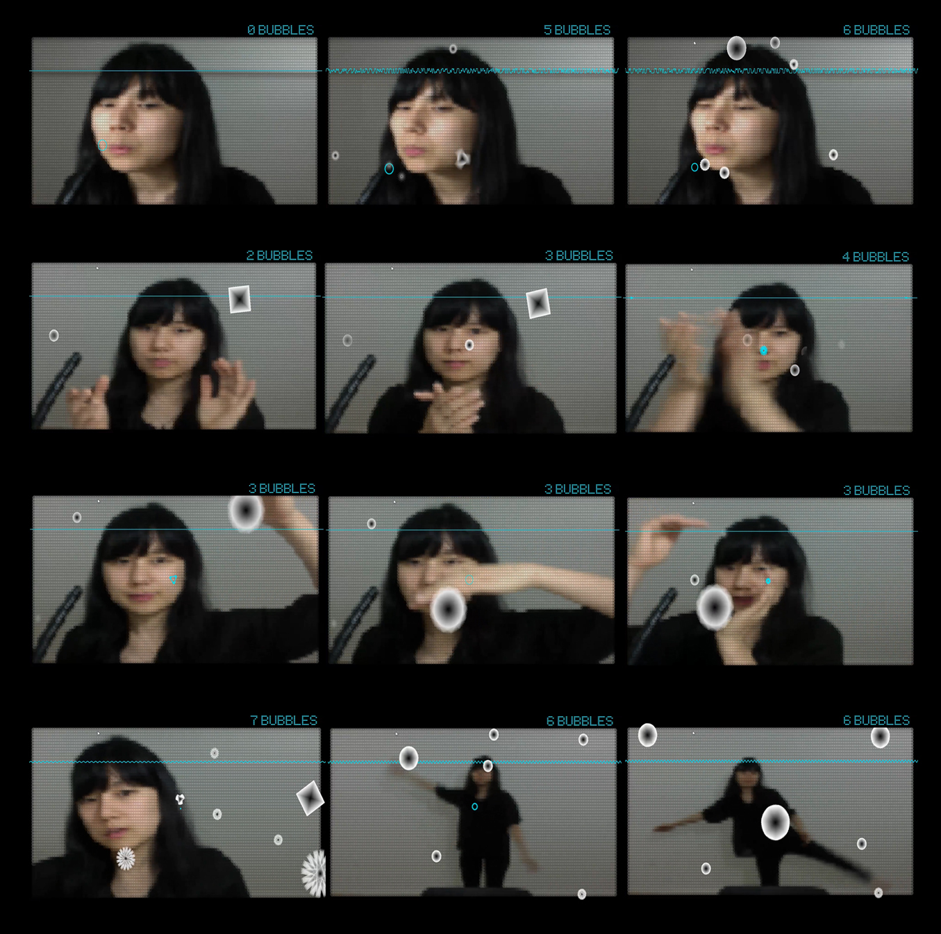 Following the notion of ubiquitous computing, the setup only requires a webcam and a microphone, which are available on most computers, so that anyone can play the game anytime, anywhere. The intent of the project was to make a fun and accessible computer-based game for people of all ages. The goal was to move away from mouse-based interaction and take inputs analogous to natural actions children make when playing with bubbles. The low-res display encourages people of all ages to become more playful and expressive with their movements. Not only is the intuitive interface essential for human-computer interaction but it also invites interaction between friends and strangers alike.