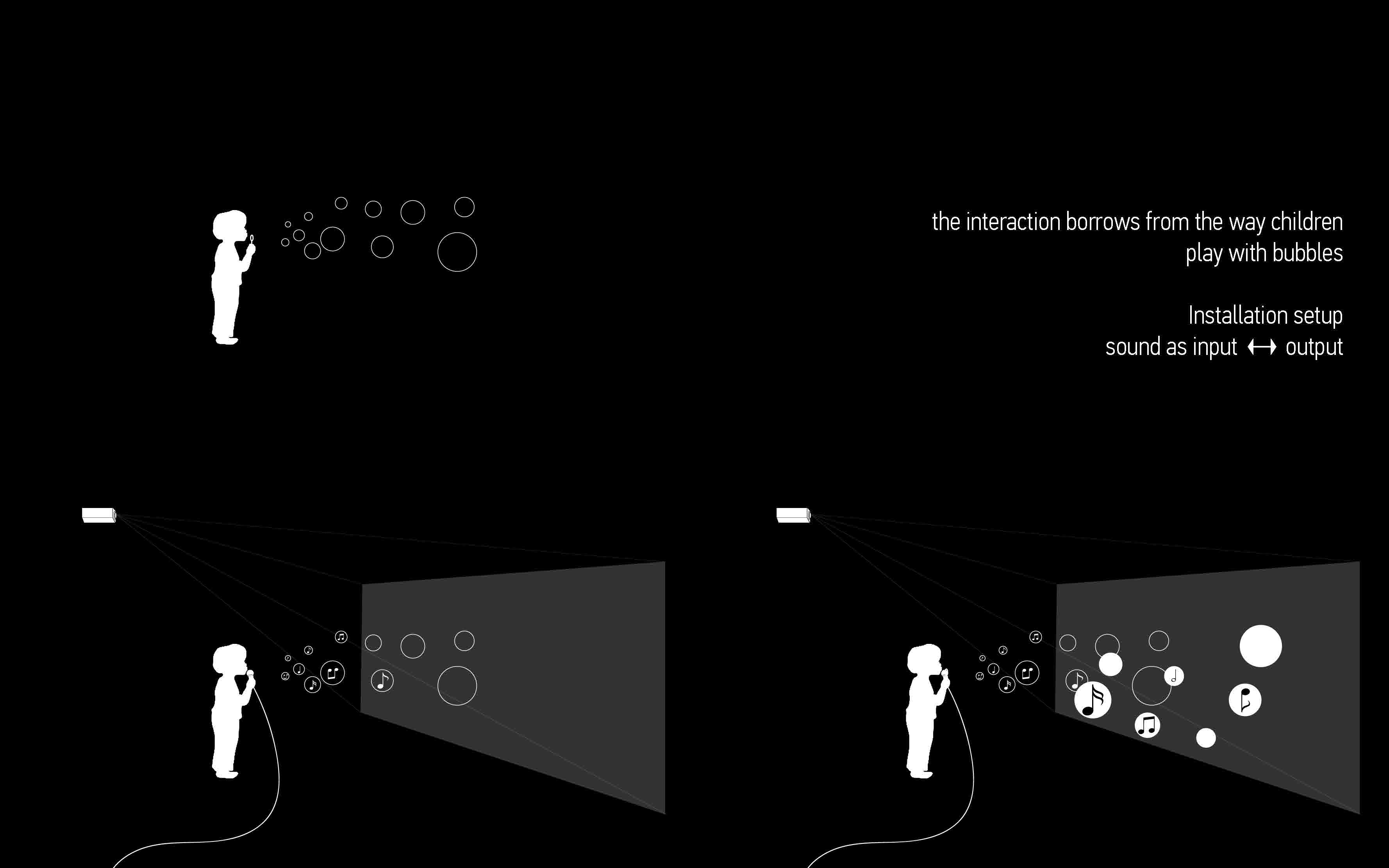 The gameplay follows the way children play with bubbles. Through a built-in microphone, people can blow differently shaped virtual bubbles into the digital canvas based on the frequency of their voice while also interacting with them through body gestures captured by a camera. The velocity and shape of the bubbles as well as the rate at which they are created depend on the volume (i.e. pressure) and the peak sound frequency at which they are blown. For example, blowing into the microphone creates high pressure, allowing players to create many bubbles quickly. By whistling and singing at different sound frequencies, they can affect the velocities of digital bubbles blown towards one side of the screen. Fast moving bubbles are generated with high frequency sounds while slower bubbles are created with lower frequencies. Once the bubbles are in the virtual space, players can interact with them through gestures. They can combine them into bigger bubbles, pop other players' bubbles, maneuver bubbles around obstacles, all by using any kinesthetic interactions imaginable. Although existing in virtual space, these bubbles loosely follow the laws of conservation of mass and momentum to signify their connection to the physical world. Digital computation is used to allow for augmented interaction that cannot be otherwise accomplished in our physical space.